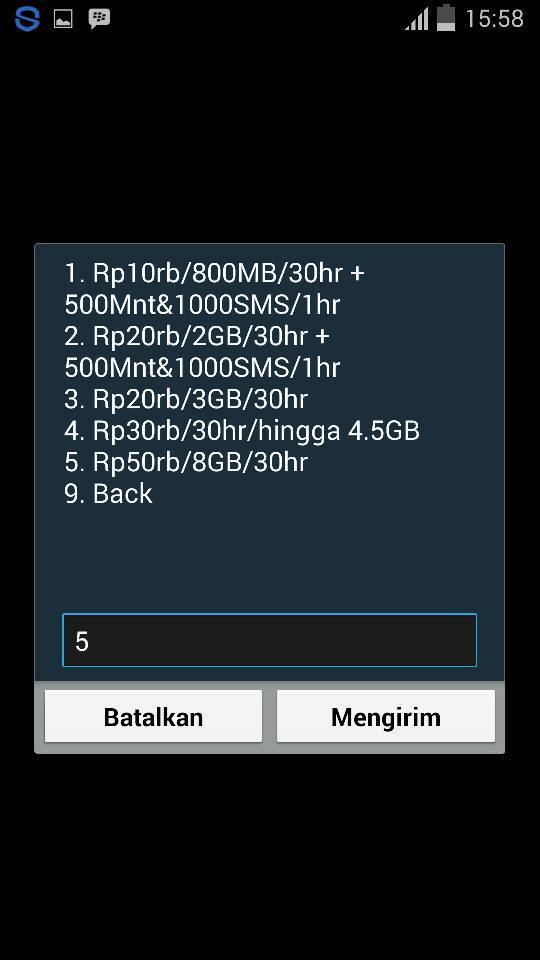 Langkah keempat, masukkan angka 5 untuk pilihan paket internet Rp50rb/8GB/30hr, lalu klik tombol kirim.